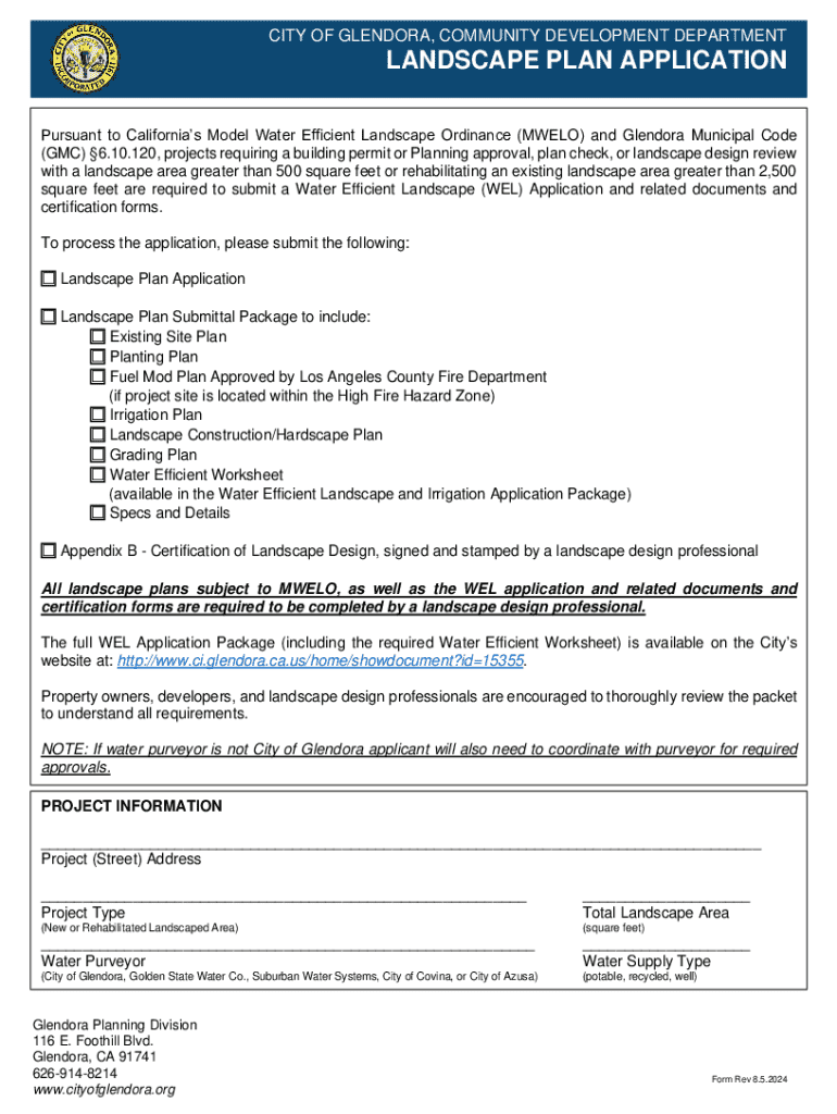 Este formulario es para la solicitud de un Plan de Paisaje conforme a la Ordenanza de Paisajes Eficientes en Agua de California y el Código Municipal de Glendora. Se requiere que los proyectos que