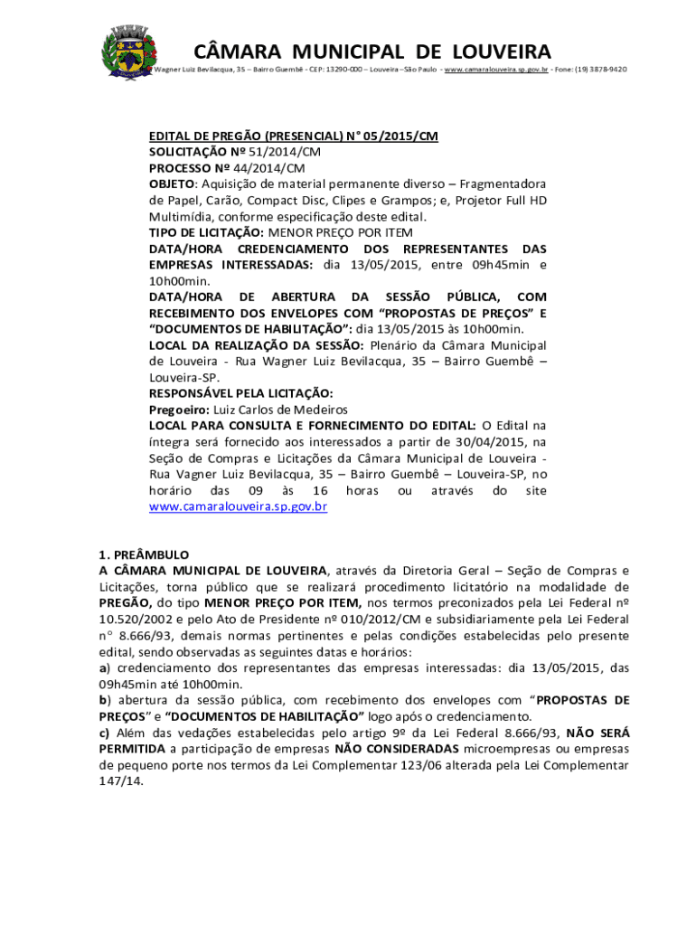 Obtenha o gratuito Edital De PregÃo (presencial) N° 05/2015/cm