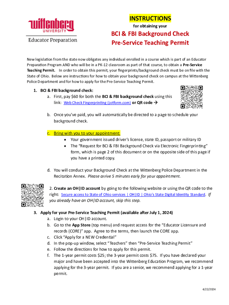 Instructions for obtaining a BCI and FBI background check required for a Pre-Service Teaching Permit in Ohio. The document outlines the process for payments, scheduling appointments, and applying for the permit along with necessary personal identification information.