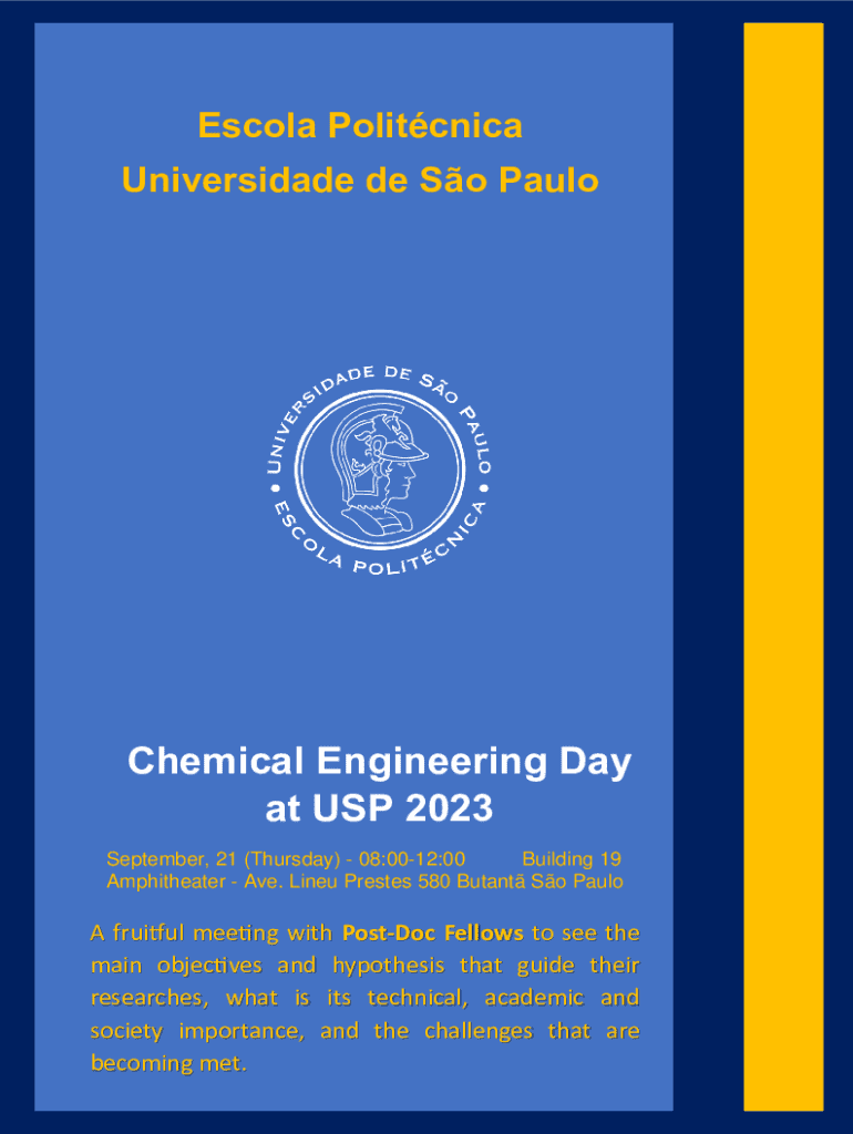 Escola Politcnica Universidade de So PauloChemical Engineering Day at USP 2023 September, 21 (Thursday) 08:0012:00 Building 19 Amphitheater Ave. Lineu Prestes 580 Butant So PauloA fruitful meeting with PostDoc Fellows to see the main objectives and hypothesis that guide their researches, what is its technical, academic and society importance, and the challenges that are becoming met.The postdoctorate, as the research activities carried out after a doctorate, was consolidated in the 20th century