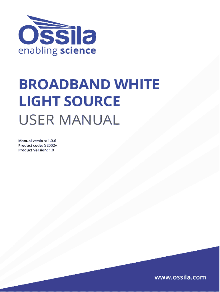 BROADBAND WHITE LIGHT SOURCE USER MANUAL Manual version: 1.0.6 Product code: G2002A Product Version: 1.0User ManualBroadband White Light SourceContents 1.EU Declaration of Conformity ..................................................................................................................... 32.Safety............................................................................................................................................................. 43.4.2.1Warning