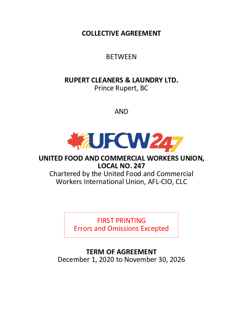 This document outlines the terms and conditions of employment between Rupert Cleaners & Laundry Ltd. and the United Food and Commercial Workers Union, Local No. 247. It includes articles on wages,