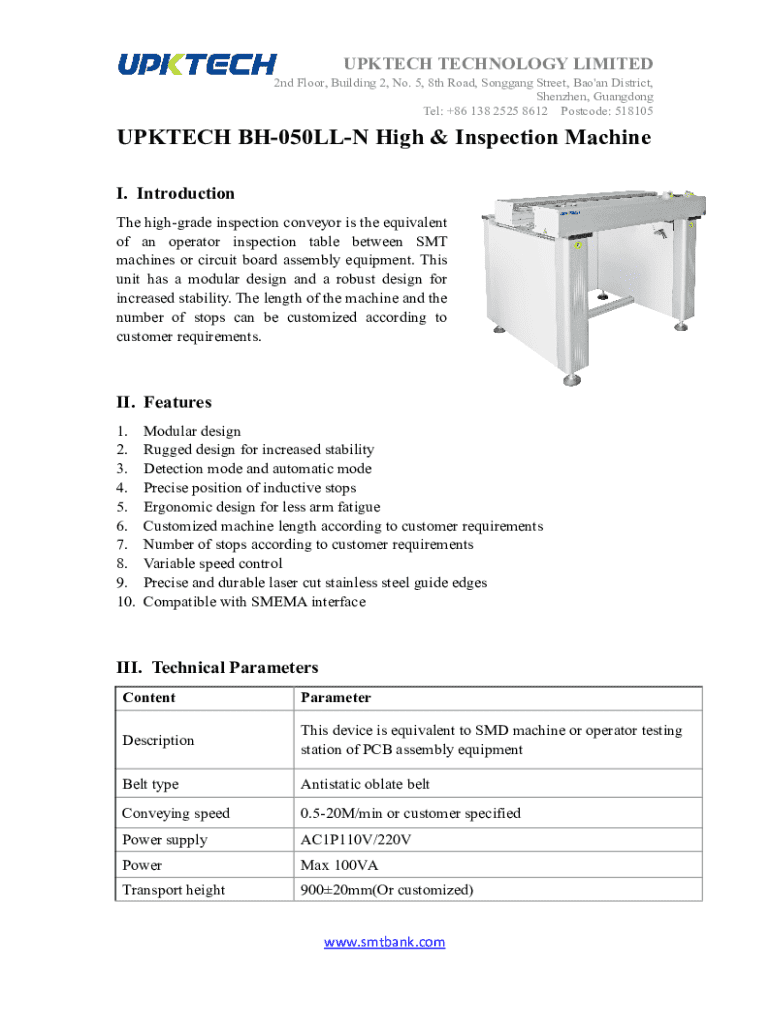 UPKTECH TECHNOLOGY LIMITED 2nd Floor, Building 2, No. 5, 8th Road, Songgang Street, Bao\'an District, Shenzhen, Guangdong Tel: +86 138 2525 8612 Postcode: 518105UPKTECH BH050LLN High & Inspection Machine I. Introduction The highgrade inspection conveyor is the equivalent of an operator inspection table between SMT machines or circuit board assembly equipment. This unit has a modular design and a robust design for increased stability. The length of the machine and the number of stops can be...