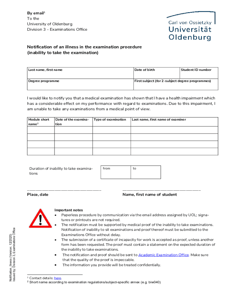 By email1 To the University of Oldenburg Division 3 Examinations OfficeNotification of an illness in the examination procedure (inability to take the examination)Last name, first nameDate of birthStudent