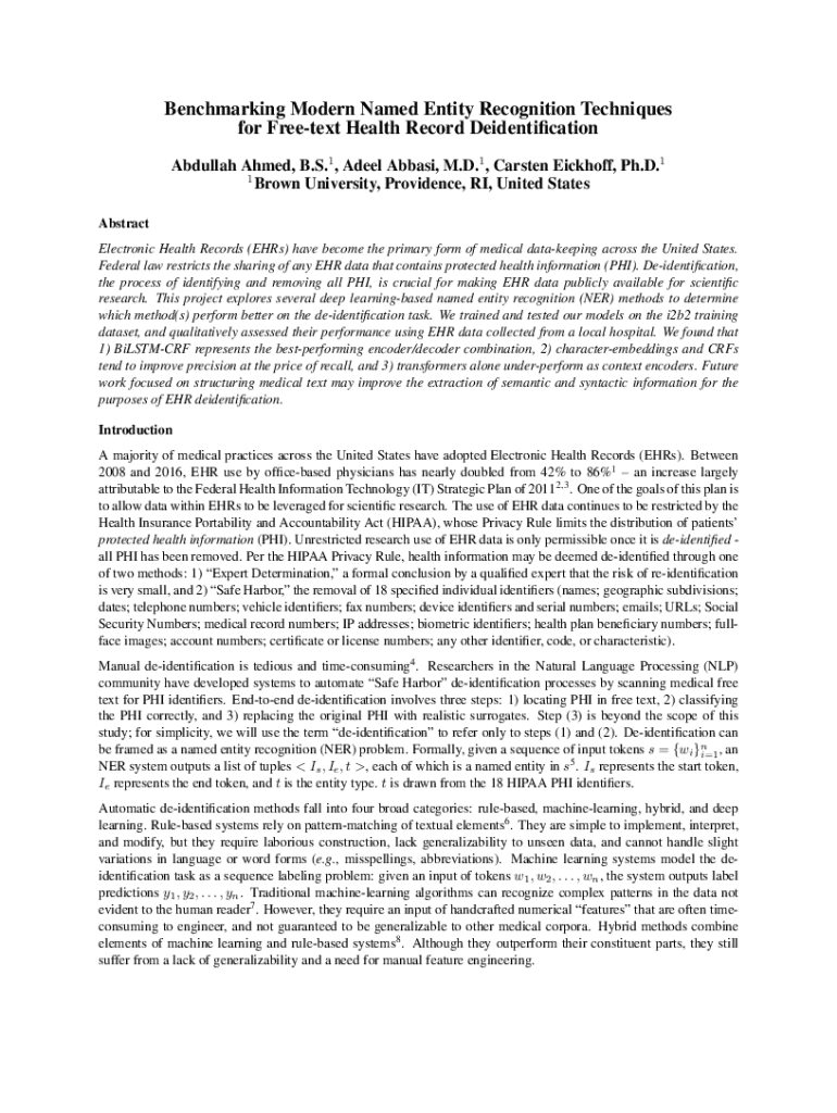 Benchmarking Modern Named Entity Recognition Techniques for Freetext Health Record Deidentification Abdullah Ahmed, B.S.1 , Adeel Abbasi, M.D.1 , Carsten Eickhoff, Ph.D.1 1 Brown University, Providence, RI, United States Abstract Electronic Health Records (EHRs) have become the primary form of medical datakeeping across the United States. Federal law restricts the sharing of any EHR data that contains protected health information (PHI). Deidentification, the process of identifying and removing
