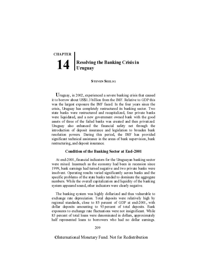CHAPTER14Resolving the Banking Crisis in Uruguay STEVEN SEELIGUruguay, in 2002, experienced a severe banking crisis that caused it to borrow about US$1.3 billion from the IMF. Relative to GDP this