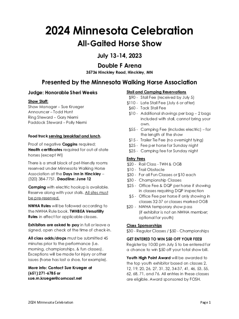 Este evento se llevará a cabo del 13 al 14 de julio de 2024 en Double F Arena, Hinckley, Minnesota, presentado por la Minnesota Walking Horse Association. Se requerirá prueba de Coggins negativo y certificados de salud para caballos de fuera del estado. Las reservas de establos y camping están disponibles, y se seguirán las reglas de NWHA.