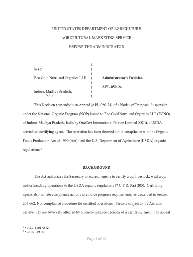 UNITED STATES DEPARTMENT OF AGRICULTURE AGRICULTURAL MARKETING SERVICE BEFORE THE ADMINISTRATORIn re: Eco Gold Nutri and Organics LLP Indore, Madhya Pradesh, India) ) ) ) ) ) ) )Administrators Decision