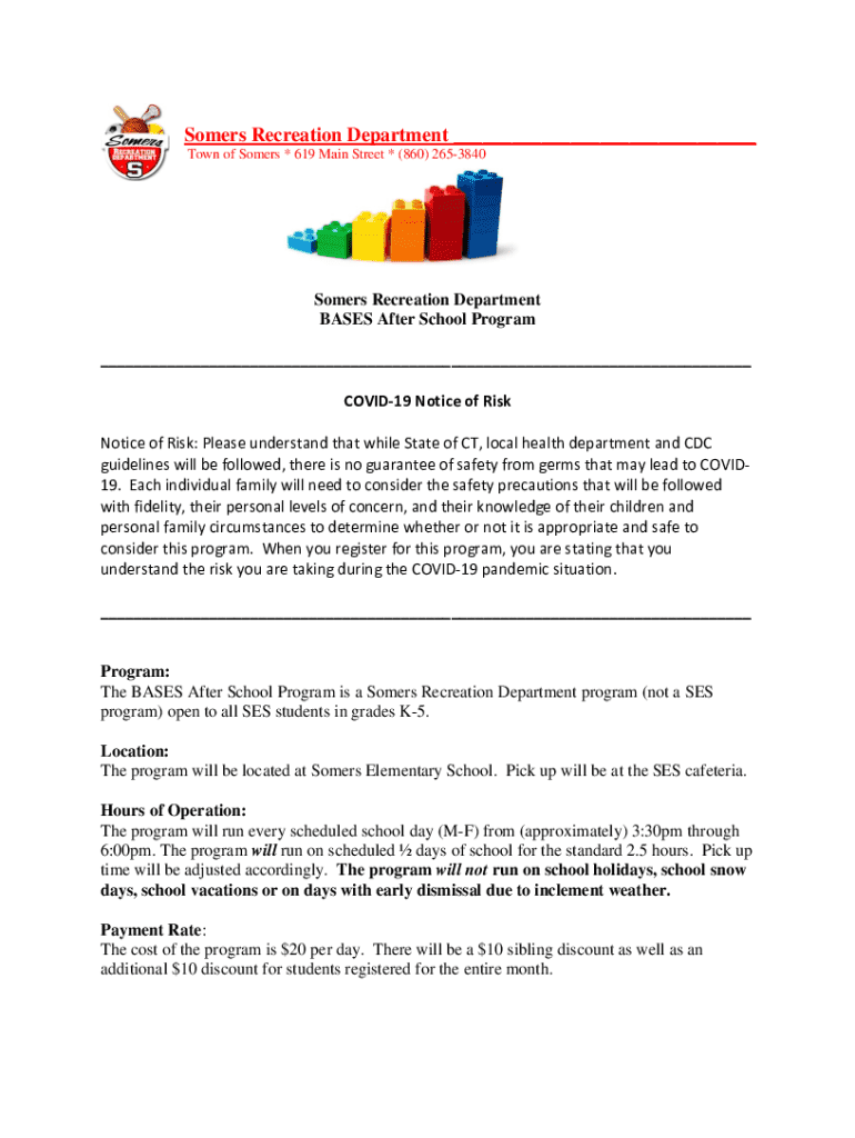 Este documento proporciona información importante sobre el programa BASES After School del Departamento de Recreación de Somers, incluyendo detalles sobre el registro, costos, horarios, políticas