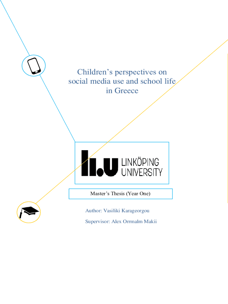 Childrens perspectives on social media use and school life in GreeceMasters Thesis (Year One) Author: Vasiliki Karageorgou Supervisor: Alex Orrmalm MakiiABSTRACTSocial Media have grown extremely popular among adolescents and young children over the past few years. Provided with the chance to keep in touch with their friends and share content that interests them, young students in Greece spend a great amount of time on various social media platforms. But to what extent and in which ways,