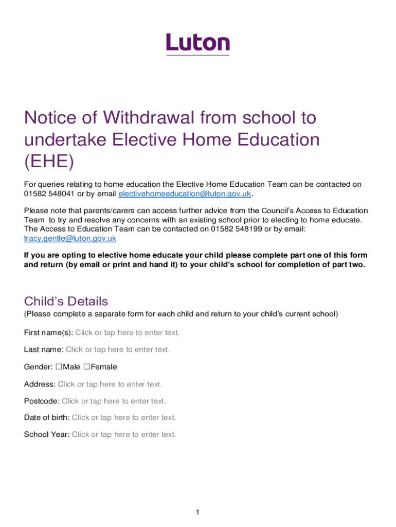 This document serves as a notice for parents or carers intending to withdraw their child from school to pursue Elective Home Education (EHE). It requires completion of child and parent details, reasons for withdrawal, and school information. The form must be submitted to the child\'s current school.