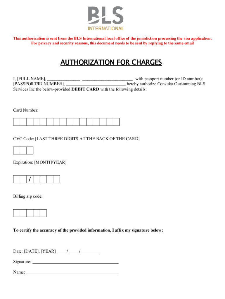This document serves as an authorization for charges related to a visa application processed by BLS International. It requires the applicant\'s personal details, card information, and signature to validate the charge.