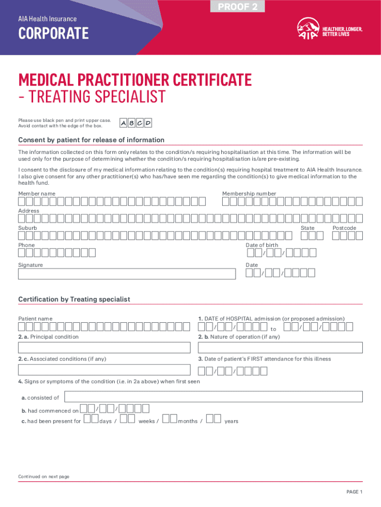 PROOF 2 AIA Health InsuranceCORPORATEMEDICAL PRACTITIONER CERTIFICATE TREATING SPECIALIST Please use black pen and print upper case. Avoid contact with the edge of the box.Consent by patient for release