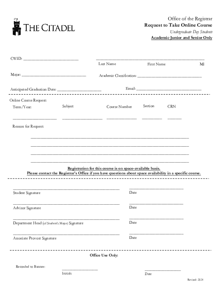 This form is a request for undergraduate day students, specifically juniors and seniors, to enroll in an online course for a specified term and year. It requires personal information, course details, and signatures from relevant authorities.