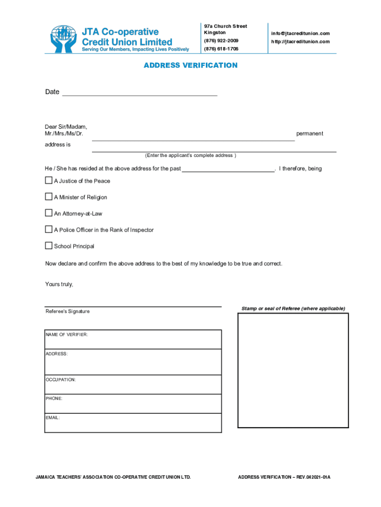 97a Church Street Kingstoninfo@jtacreditunion.com(876) 9222009http://jtacreditunion.com(876) 6181706ADDRESS VERIFICATIONDateDear Sir/Madam, Mr./Mrs./Ms/Dr.permanentaddress is (Enter the applicants complete address )He / She has resided at the above address for the past. I therefore, beingA Justice of the Peace A Minister of Religion An AttorneyatLaw A Police Officer in the Rank of Inspector School Principal Now declare and confirm the above address to the best of my knowledge to be true and...