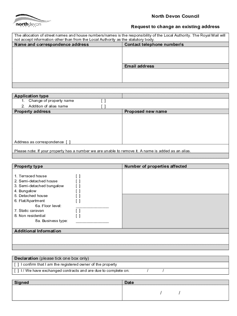 This form is used to request a change of an existing address or to add an alias name to a property in North Devon. The process is governed by the Local Authority, and certain requirements need to