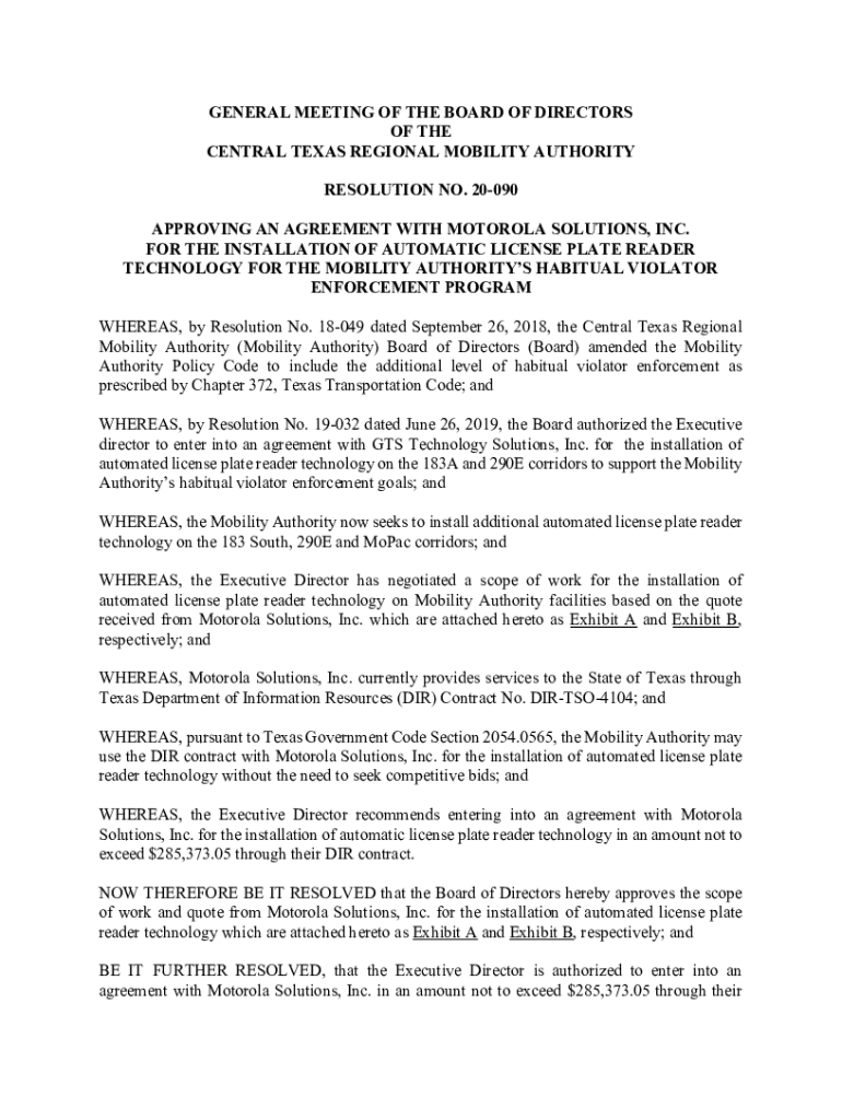 GENERAL MEETING OF THE BOARD OF DIRECTORS OF THE CENTRAL TEXAS REGIONAL MOBILITY AUTHORITY RESOLUTION NO. 20090 APPROVING AN AGREEMENT WITH MOTOROLA SOLUTIONS, INC. FOR THE INSTALLATION OF AUTOMATIC LICENSE PLATE READER TECHNOLOGY FOR THE MOBILITY AUTHORITYS HABITUAL VIOLATOR ENFORCEMENT PROGRAM WHEREAS, by Resolution No. 18049 dated September 26, 2018, the Central Texas Regional Mobility Authority (Mobility Authority) Board of Directors (Board) amended the Mobility Authority Policy Code to