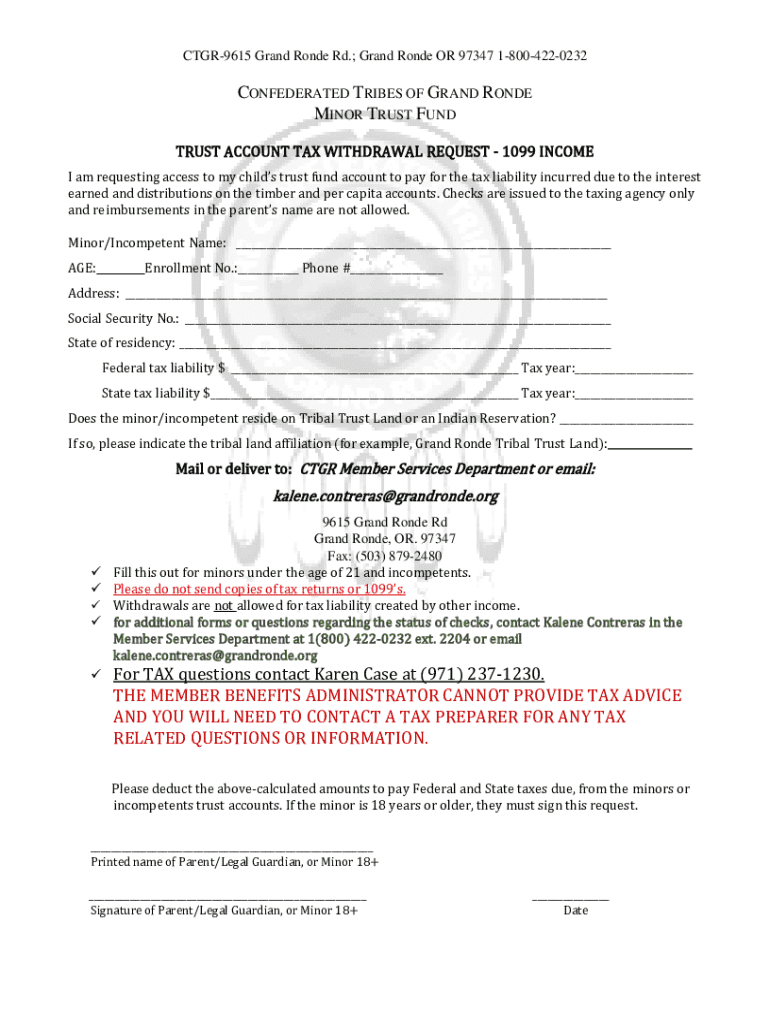 Request for access to a minor\'s trust fund account to cover tax liabilities incurred from accrued interest and distributions on timber and per capita accounts. This form is intended for minors under