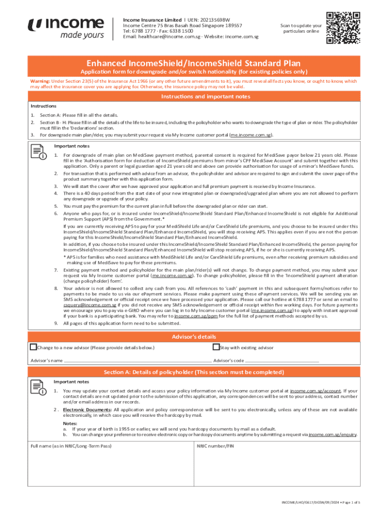 This application form is intended for existing policyholders who wish to downgrade their current insurance plan or switch their nationality under the Enhanced IncomeShield or IncomeShield Standard Plan. It contains essential instructions, notes, and sections to complete for processing the request, including consent regarding the impact of changes on the insurance policy.