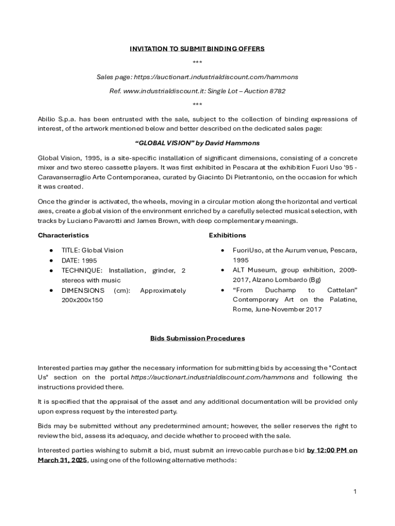 INVITATION TO SUBMIT BINDING OFFERS *** Sales page: https://auctionart.industrialdiscount.com/hammons Ref. www.industrialdiscount.it: Single Lot Auction 8782 *** Abilio S.p.a. has been entrusted with