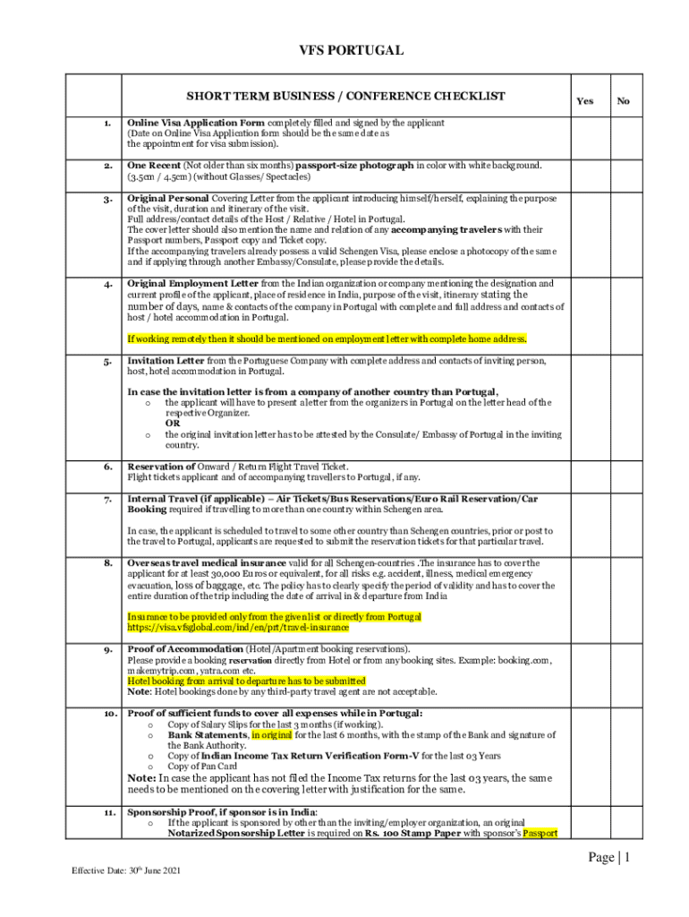 A comprehensive checklist for applicants seeking a short term business or conference visa to Portugal. It includes requirements such as completed online visa application, passport-sized photographs,