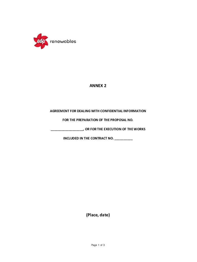 ANNEX 2AGREEMENT FOR DEALING WITH CONFIDENTIAL INFORMATION FOR THE PREPARATION OF THE PROPOSAL NO. ___, OR FOR THE EXECUTION OF THE WORKS INCLUDED IN THE CONTRACT NO. ___(Place, date)Page 1 of 3AGREEMENT