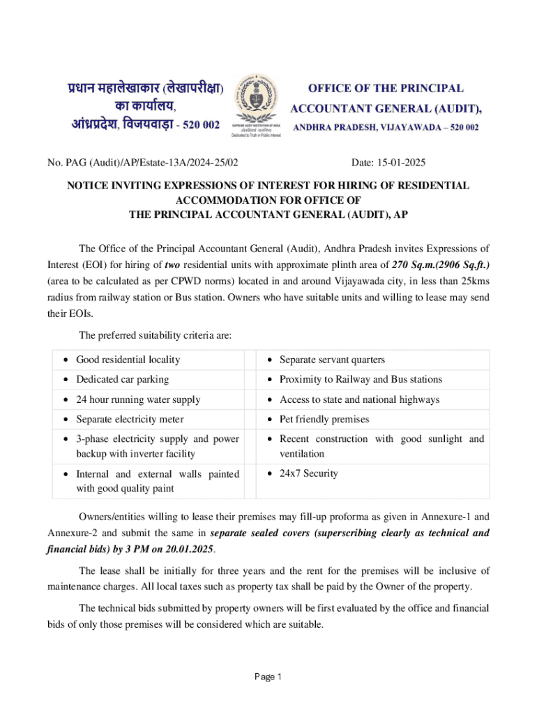 No. PAG (Audit)/AP/Estate13A/202425/02Date: 15012025NOTICE INVITING EXPRESSIONS OF INTEREST FOR HIRING OF RESIDENTIAL ACCOMMODATION FOR OFFICE OF THE PRINCIPAL ACCOUNTANT GENERAL (AUDIT), AP The Office of the Principal Accountant General (Audit), Andhra Pradesh invites Expressions of Interest (EOI) for hiring of two residential units with approximate plinth area of 270 Sq.m.(2906 Sq.ft.) (area to be calculated as per CPWD norms) located in and around Vijayawada city, in less than 25kms radius...