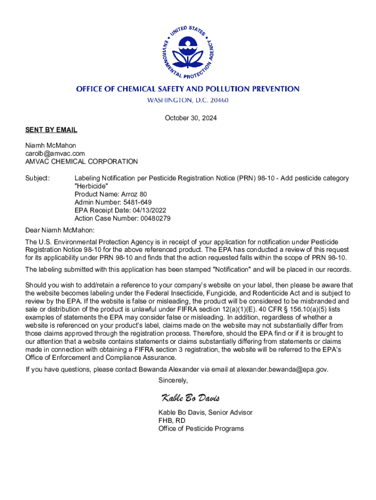 Notification from the U.S. Environmental Protection Agency regarding the registration and labeling of the pesticide product Arroz 80, noting its uses, hazards, and application guidelines.