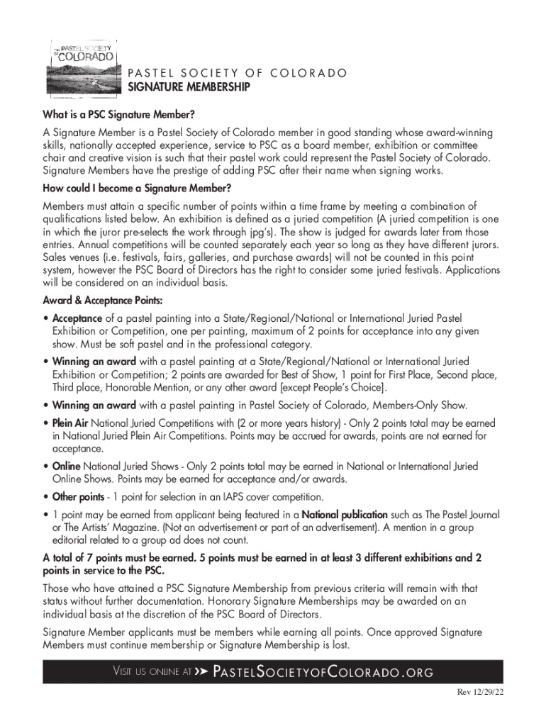This document outlines the requirements and application process for becoming a Signature Member of the Pastel Society of Colorado, including points system for awards, exhibitions, and documentation
