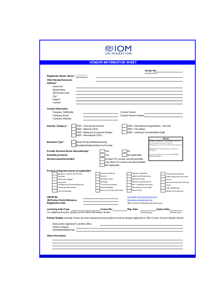 A vendor information sheet is a document used to collect and organize the relevant details about a vendor or supplier, including contact information, payment terms, and tax identification numbers.
