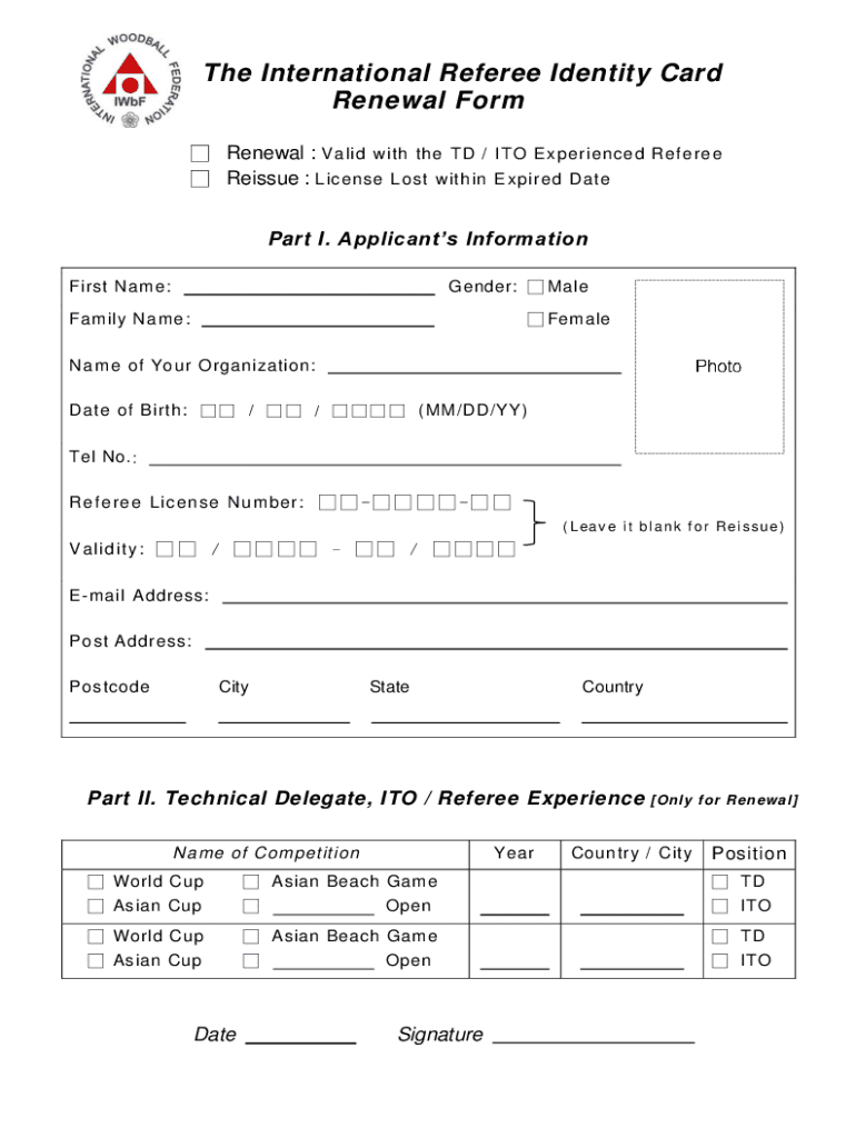 This form is used to renew or reissue the International Referee Identity Card for referees. It collects personal information, referee experience, and details related to the renewal or reissue process.