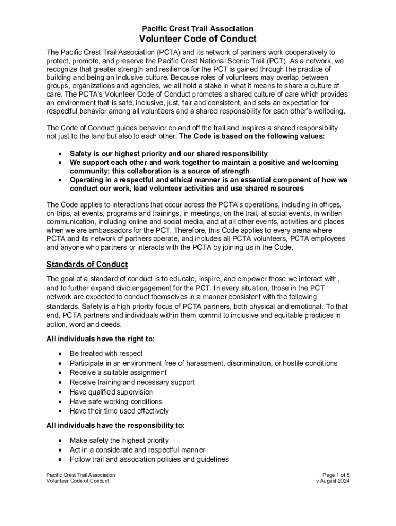 This document outlines the standards of conduct expected of volunteers involved with the Pacific Crest Trail Association, emphasizing safety, respect, and inclusivity. It promotes a culture of care among all participants and addresses misconduct and reporting mechanisms.