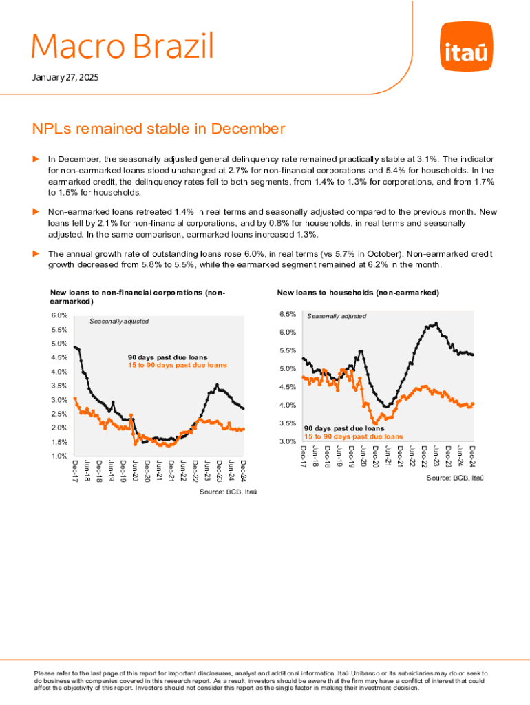 Macro Brazil January 27, 2025NPLs remained stable in December In December, the seasonally adjusted general delinquency rate remained practically stable at 3.1%. The indicator for nonearmarked loans