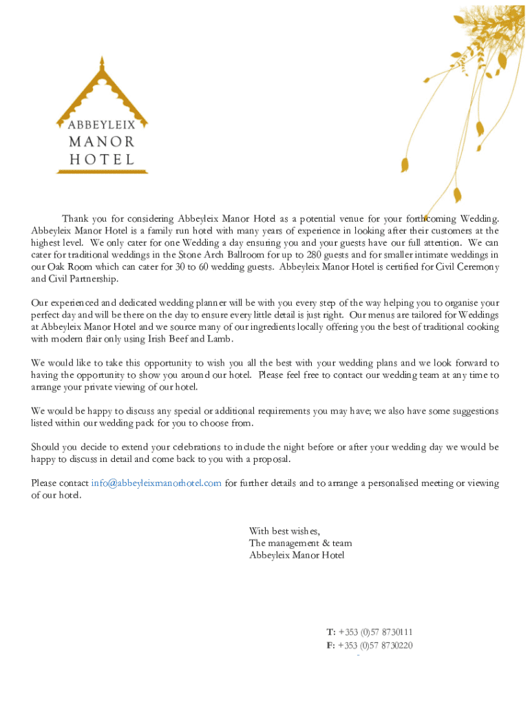 Fill out your 20222023 abbeyleix manor hotel online with pdfFiller!