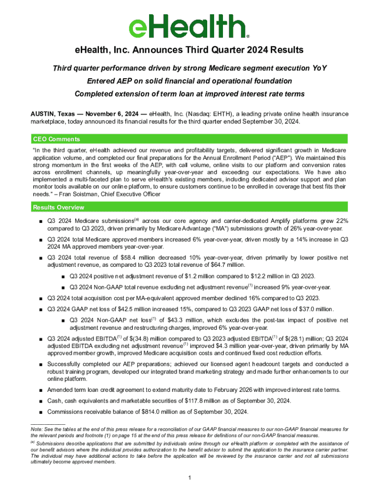 eHealth, Inc. Announces Third Quarter 2024 Results Third quarter performance driven by strong Medicare segment execution YoY Entered AEP on solid financial and operational foundation Completed extension