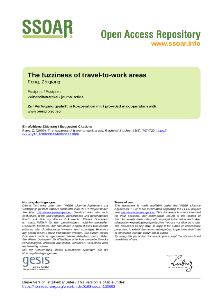 www.ssoar.infoThe fuzziness of traveltowork areas Feng, ZhiqiangPostprint / Postprint Zeitschriftenartikel / journal article Zur Verfgung gestellt in Kooperation mit / provided in cooperation with: www.peerproject.euEmpfohlene Zitierung / Suggested Citation: Feng, Z. (2009). The fuzziness of traveltowork areas. Regional Studies, 43(5), 707720. https:// doi.org/10.1080/00343400801922806Nutzungsbedingungen: Dieser Text wird unter dem \"PEER Licence Agreement zur Verfgung\" gestellt.