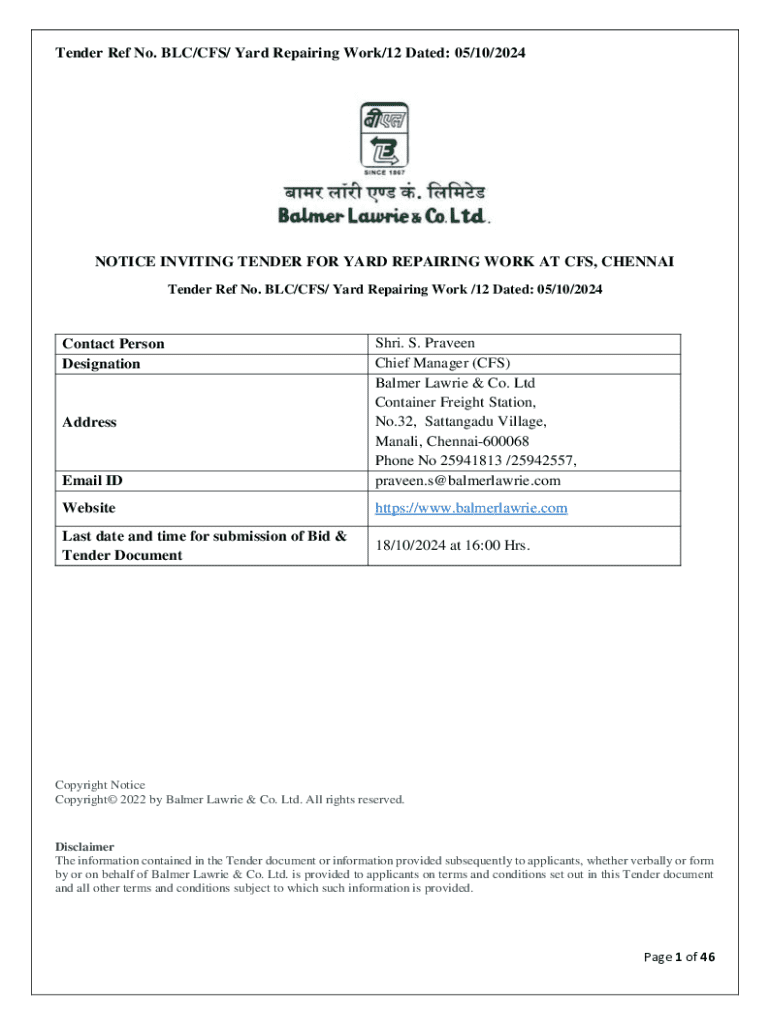 Tender Ref No. BLC/CFS/ Yard Repairing Work/12 Dated: 05/10/2024NOTICE INVITING TENDER FOR YARD REPAIRING WORK AT CFS, CHENNAI Tender Ref No. BLC/CFS/ Yard Repairing Work /12 Dated: 05/10/2024Email