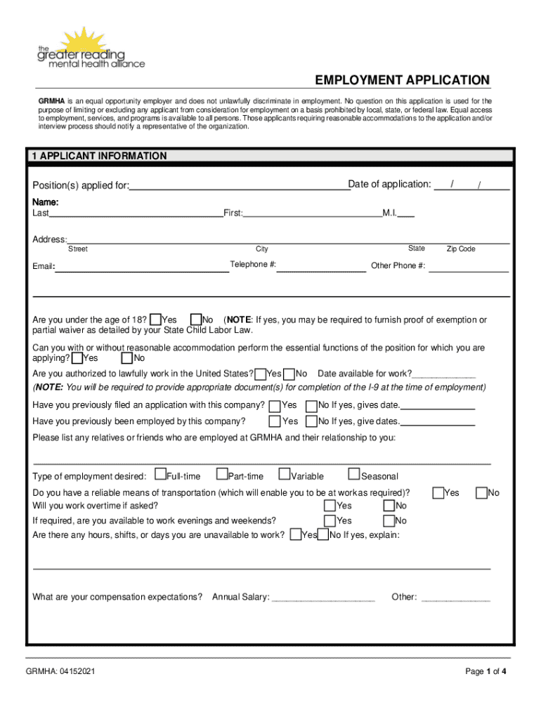 This document is an application form for prospective employees at GRMHA, an equal opportunity employer. It collects personal information, employment history, education, skills, and references, while also ensuring compliance with state and federal employment laws.