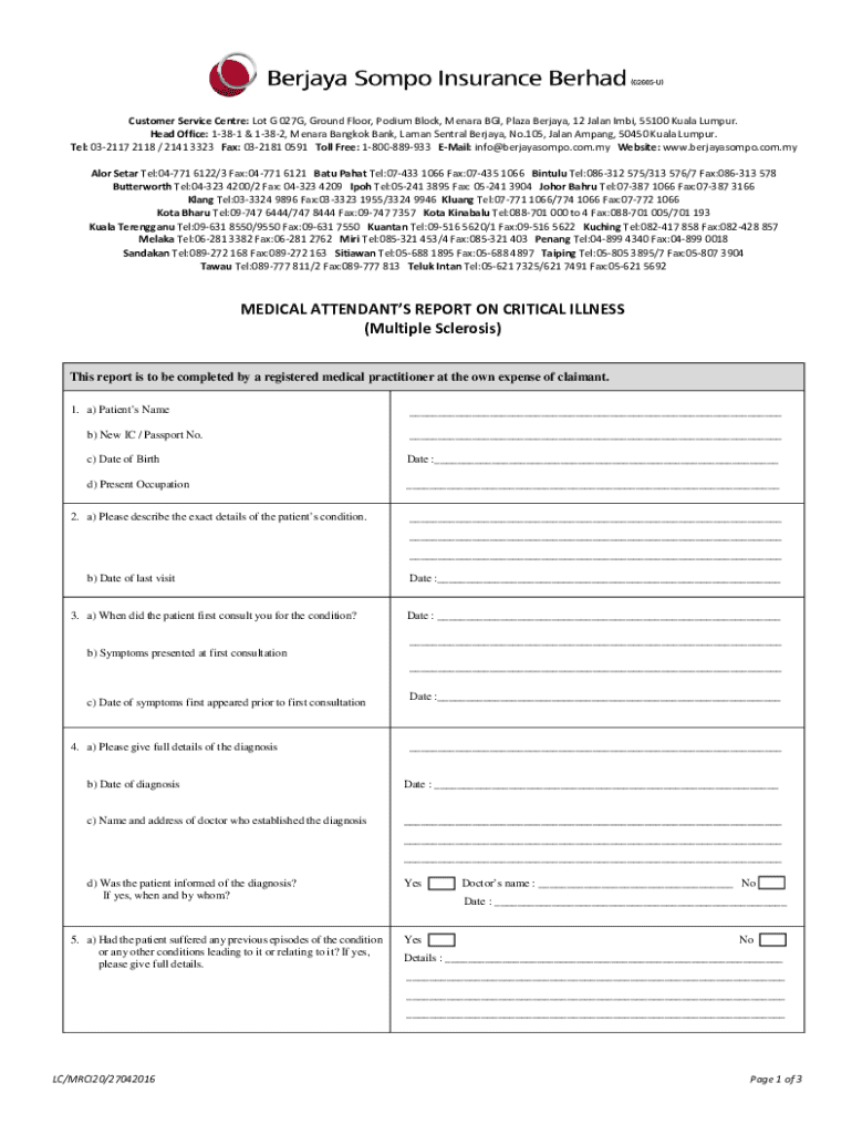 This document is to be completed by a registered medical practitioner at the own expense of the claimant. It includes sections to provide patient information, medical history, diagnosis details, and referral information regarding the condition of Multiple Sclerosis.