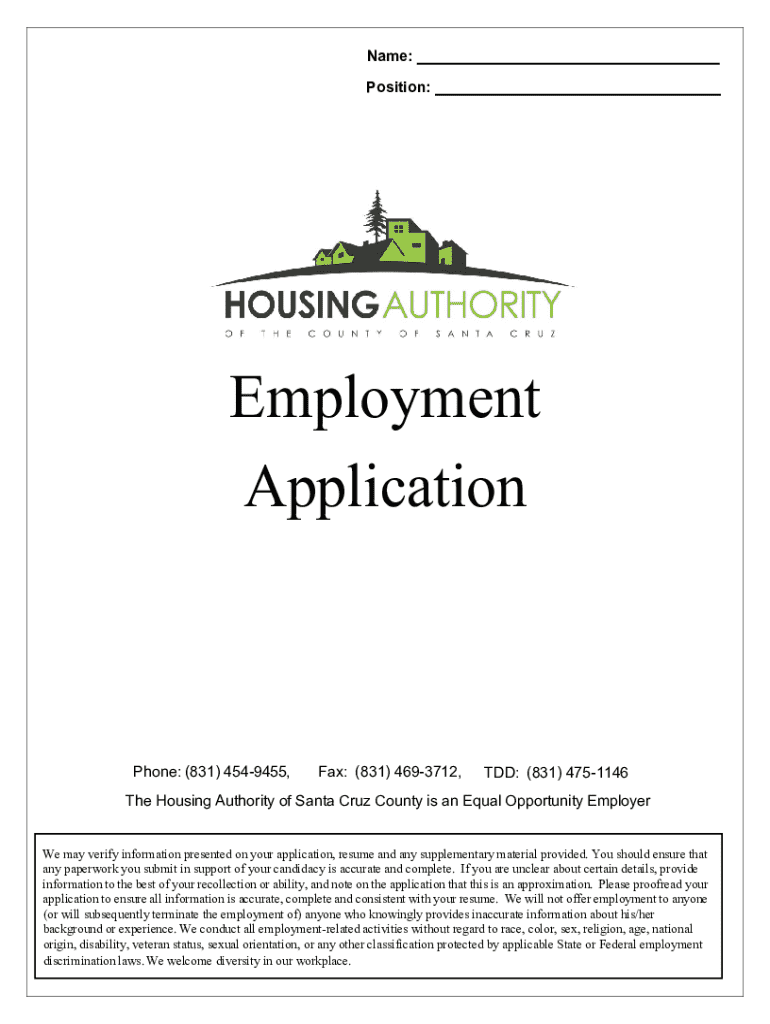 A comprehensive application form for employment with the Housing Authority of Santa Cruz County, requiring detailed personal, educational, and employment history information. The form emphasizes accuracy and integrity in the application process, while outlining the conditions for employment and the verification of information.