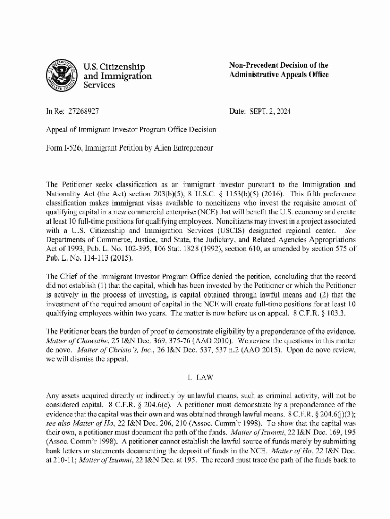 This document outlines the appeal of an immigrant investor seeking classification under the EB-5 program, analyzing evidence related to the lawful source of investment funds and job creation requirements.