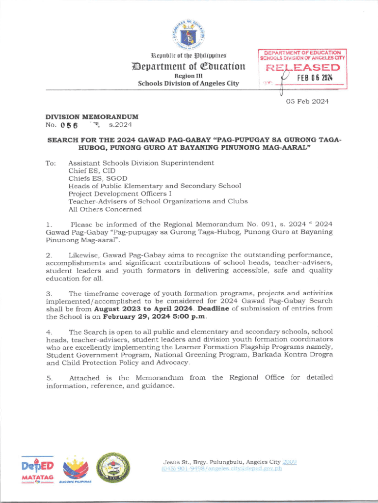 05 Feb 2024DlvlsloN MEMORANDun4 No.056TTF,s.2024SEARCH FOR THE 2024 GAWAD FAGGABAY \"PAGPUPUGAY SA GURONG TAGAHUBOG, PUNONG GURO AT BAyANING plNUNONG MACAARALTo:Assistant schools Division superintendent Chief ES, CID Chiefs ES, SGODHeads of Public Elementary and Secondary School Project Development Ofricers I TeacherAdvisers of School Organizations and Clubs All Others Concerned 1.Please be informed of the Regional Memorandum No. 091, s. 2024 \" 2024Gawad PagGabay \"Fagpupugay