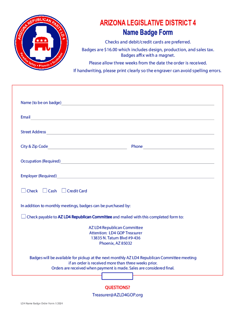 This form is used to order name badges for members of the Arizona Legislative District 4. Badges are priced at $16.00 and include design, production, and sales tax. Orders must be accompanied by payment and will be available for pickup at the next monthly meeting if received more than three weeks in advance.