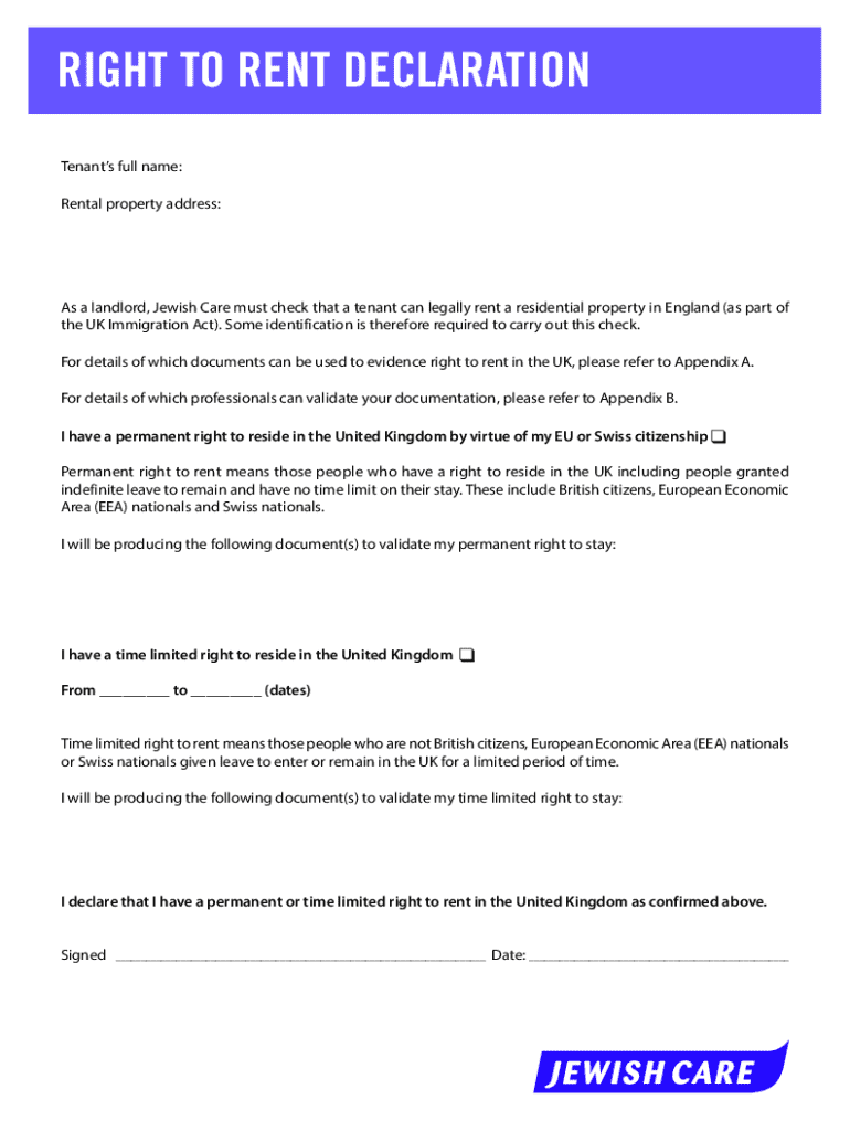 The right to rent declaration is a document that landlords or letting agents must obtain from tenants to confirm their legal right to reside in the UK and occupy rental properties.