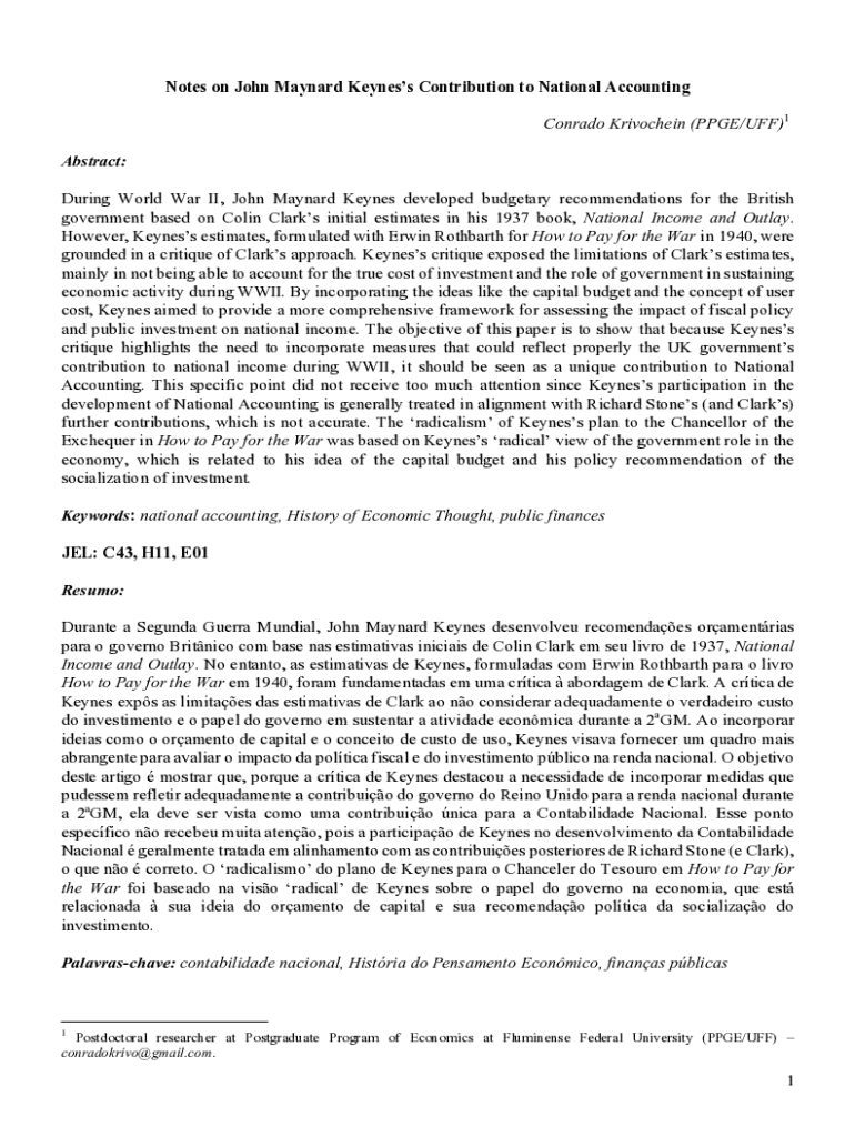 Notes on John Maynard Keyness Contribution to National Accounting Conrado Krivochein (PPGE/UFF)1 Abstract: During World War II, John Maynard Keynes developed budgetary recommendations for the British government based on Colin Clarks initial estimates in his 1937 book, National Income and Outlay. However, Keyness estimates, formulated with Erwin Rothbarth for How to Pay for the War in 1940, were grounded in a critique of Clarks approach. Keyness critique exposed the limitations of Clarks