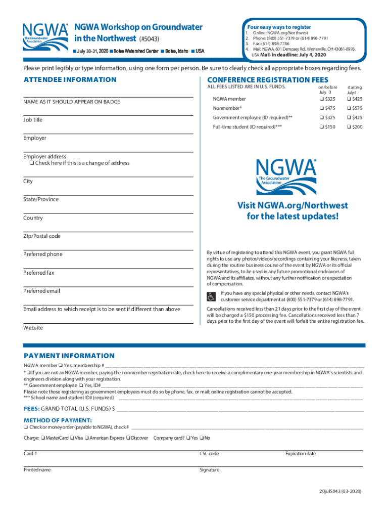 NGWA Workshop on Groundwater in the Northwest (#5043)Four easy ways to register1. 2. 3. 4.n July 3031, 2020 n Boise Watershed Center n Boise, Idaho n USAOnline: NGWA.org/Northwest Phone: (800) 5517379 or (614) 8987791 Fax: (614) 8987786 Mail: NGWA, 601 Dempsey Rd., Westerville, OH 430818978, USA Mailin deadline: July 4, 2020Please print legibly or type information, using one form per person. Be sure to clearly check all appropriate boxes regarding fees.CONFERENCE REGISTRATION FEESATTENDEE