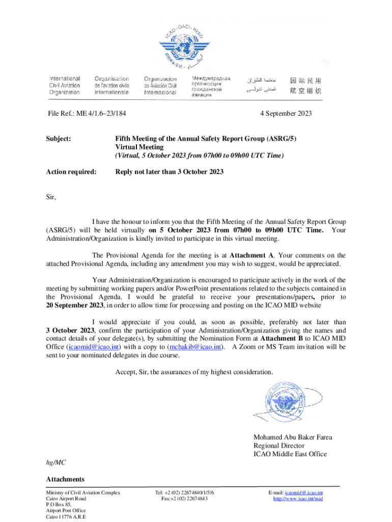 This document invites participation in the Fifth Meeting of the Annual Safety Report Group (ASRG/5), scheduled for a virtual meeting on 5 October 2023. It requests confirmation of participation along with the nomination form to be submitted by 3 October 2023.