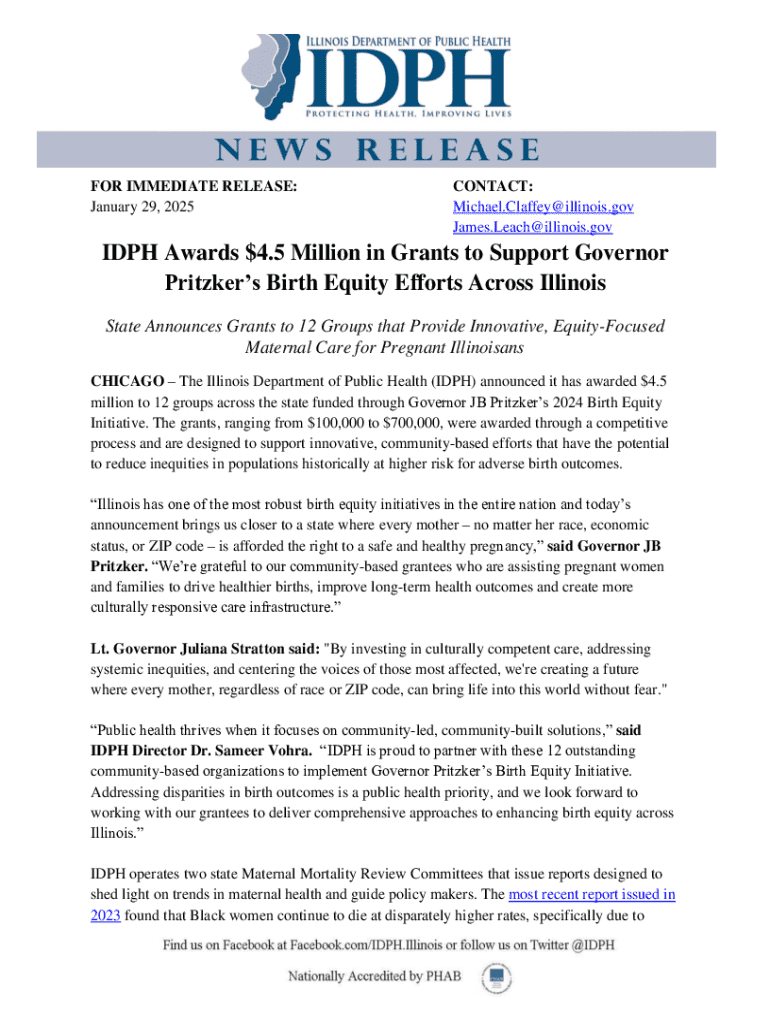 FOR IMMEDIATE RELEASE: January 29, 2025CONTACT: Michael.Claffey@illinois.gov James.Leach@illinois.govIDPH Awards $4.5 Million in Grants to Support Governor Pritzkers Birth Equity Efforts Across Illinois