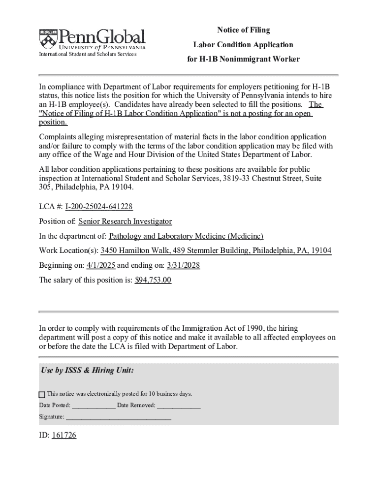 This notice complies with Department of Labor requirements regarding H-1B status for the position of Senior Research Investigator at the University of Pennsylvania.