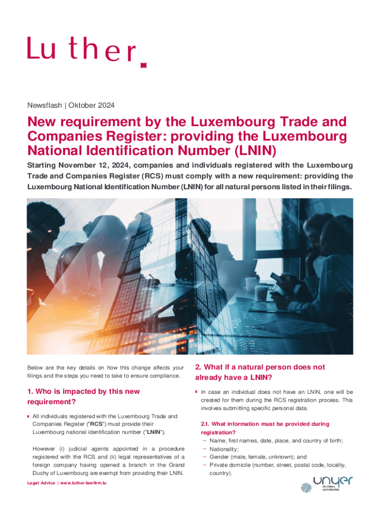 Newsflash | Oktober 2024New requirement by the Luxembourg Trade and Companies Register: providing the Luxembourg National Identification Number (LNIN) Starting November 12, 2024, companies and individuals registered with the Luxembourg Trade and Companies Register (RCS) must comply with a new requirement: providing the Luxembourg National Identification Number (LNIN) for all natural persons listed in their filings.Below are the key details on how this change affects your filings and the steps...